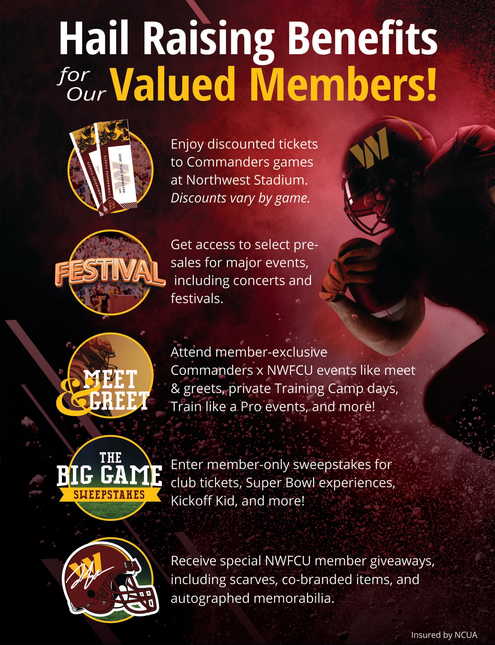 - Discounted tickets to Commanders home games (discounts variable by game)